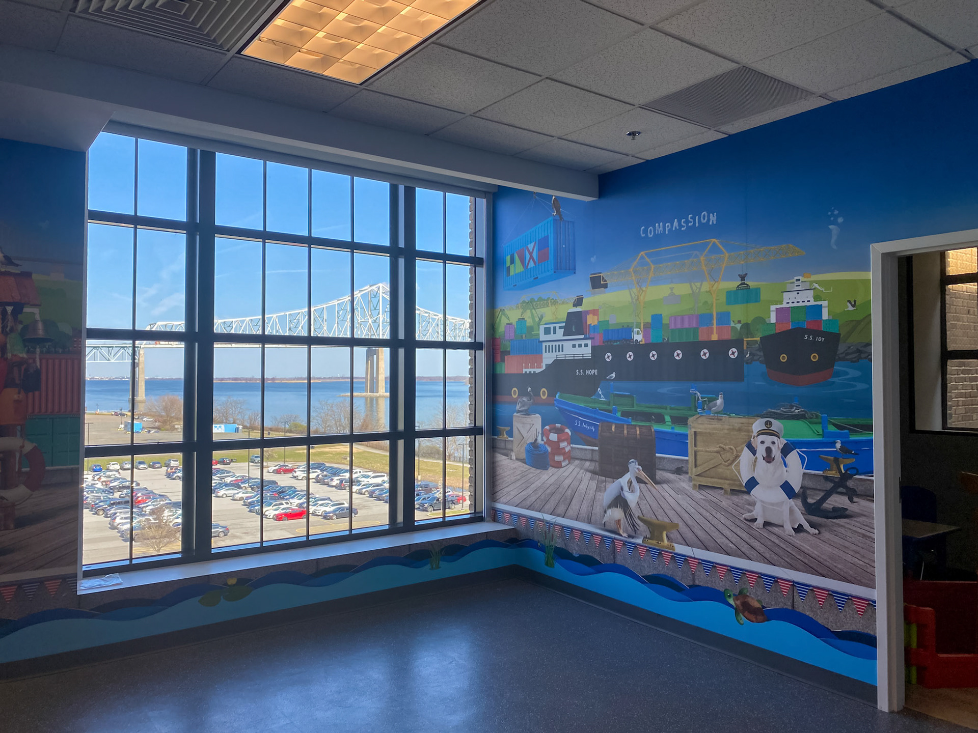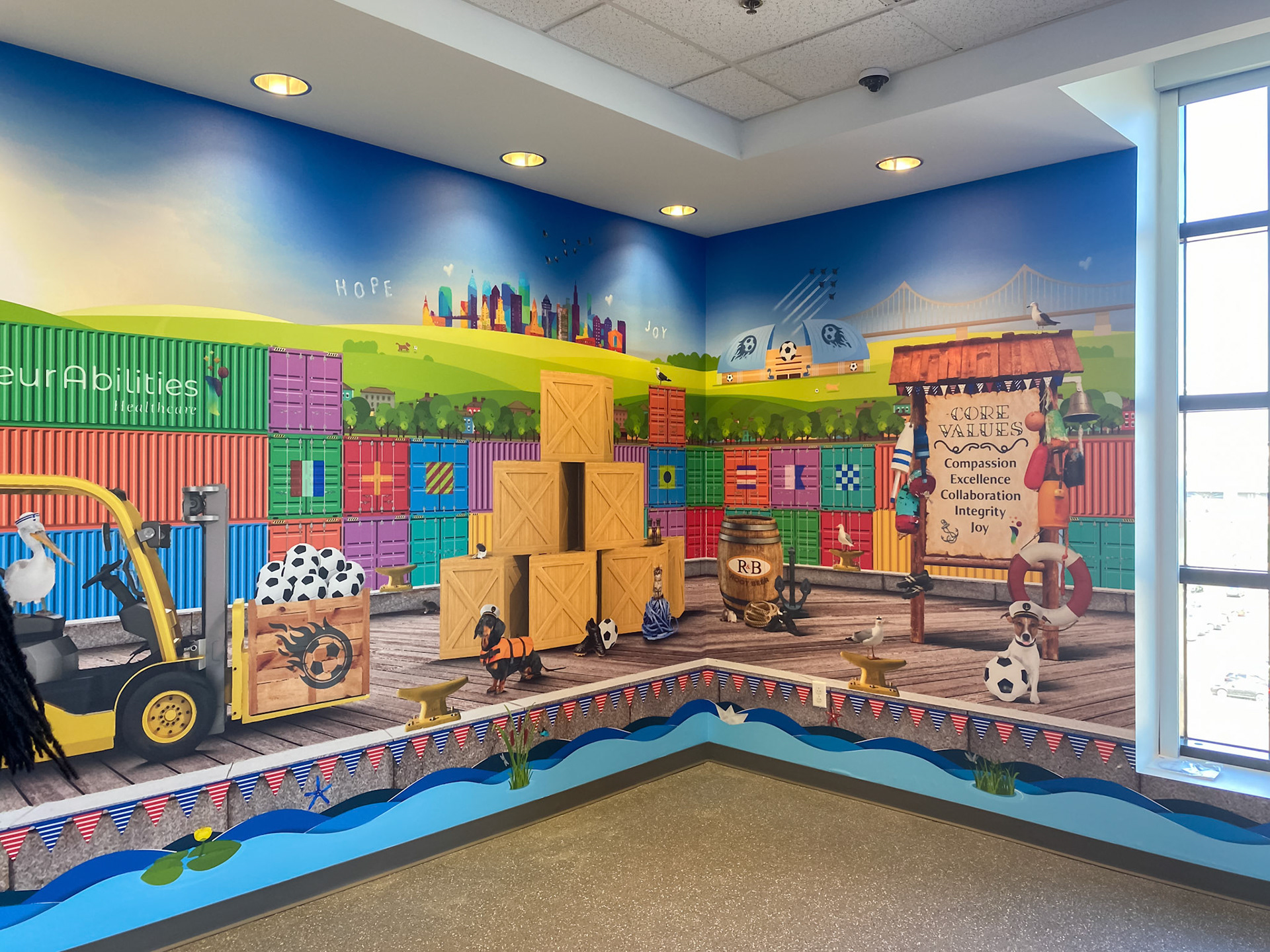 Neurabilities Healthcare: SEAPORT is a colorful four-wall mural featuring a busy, shipping pier and the large container ships frequently seen traveling up and down the Delaware River. Indigenous fish, birds and wildlife are scattered throughout the walls. The office is in the old Chester Waterside Station, which is also home to the Philadelphia Union Major League Soccer team. There are nods to the team throughout the mural.